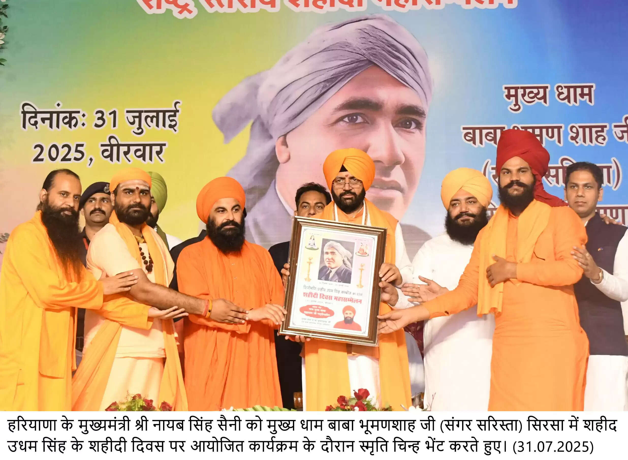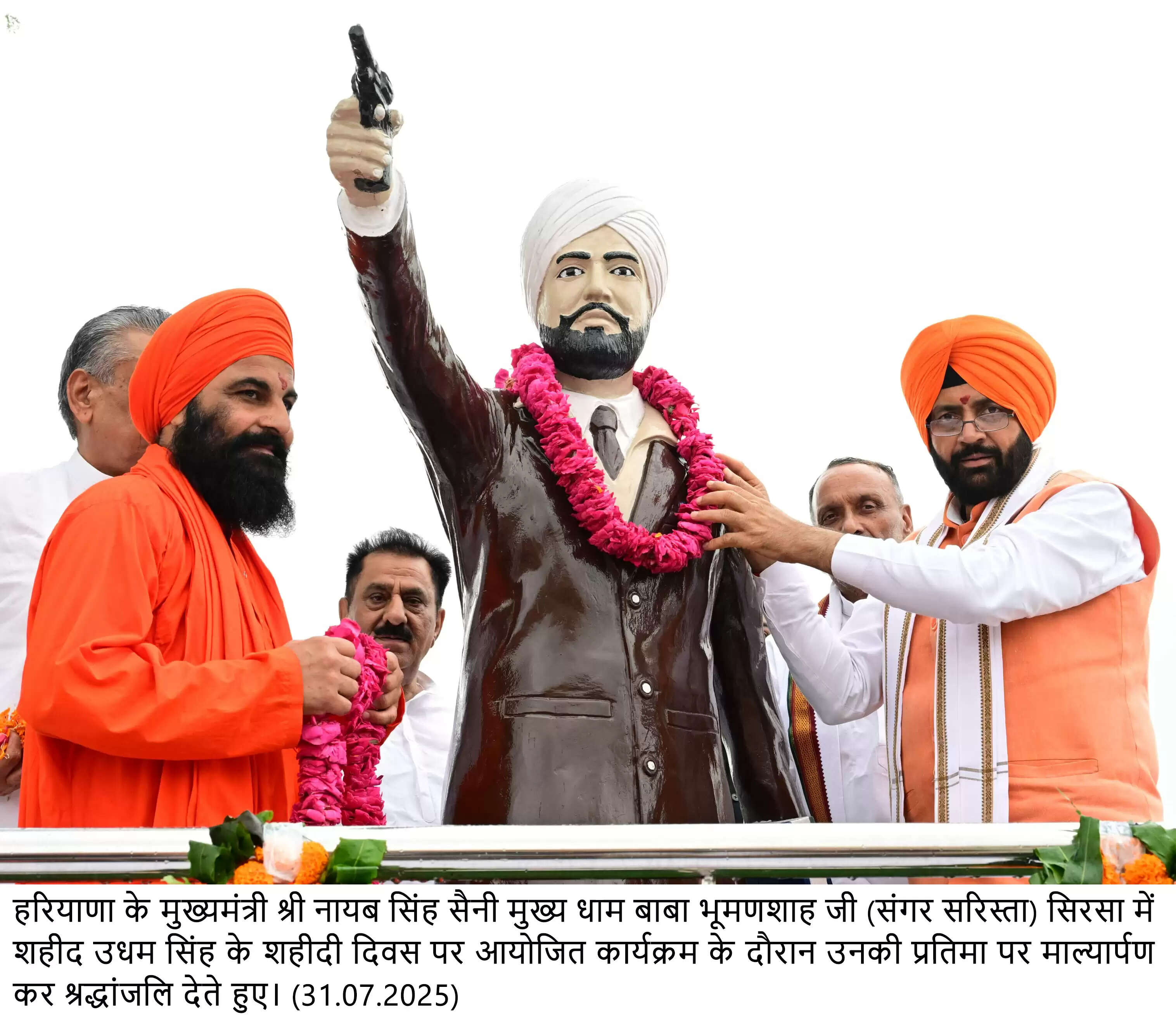सिरसा, 31 जुलाई।हरियाणा के मुख्यमंत्री श्री नायब सिंह सैनी ने शहीद उधम सिंह जी के शहीदी दिवस पर उन्हें श्रद्धांजलि अर्पित करते हुए कहा कि भारत की स्वतंत्रता की लड़ाई में उनका बलिदान राष्ट्रभक्ति, साहस और आत्मबलिदान का अप्रतिम उदाहरण है। उधम सिंह जी ने भारत माता की आज़ादी के लिए अपना सर्वस्व न्योछावर कर दिया। ‘जंग-ए-आजादी’ के इतिहास में आज भी उनका नाम स्वर्ण अक्षरों में अंकित है। आज का दिन हमें प्रेरणा देता है कि हम भी उनके आदर्शों को आत्मसात कर राष्ट्र निर्माण में सक्रिय भूमिका निभाएं।