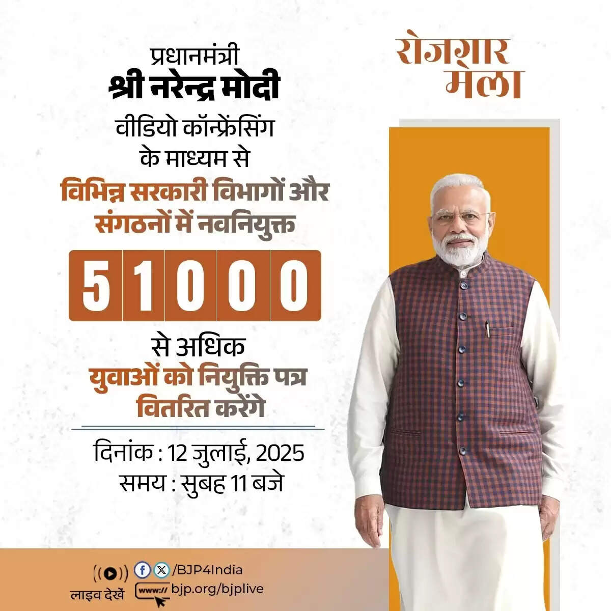 नई दिल्ली, 12 जुलाई। देशभर में आज 47 स्थानों पर 16वां रोजगार मेला लगेगा। इस अवसर पर प्रधानमंत्री नरेन्द्र मोदी नवनियुक्त 51,000 से अधिक युवाओं को नियुक्ति पत्र वितरित करेंगे। यह जानकारी भारत सरकार के पत्र एवं सूचना कार्यालय (पीआईबी) ने रोजगार मेला की पूर्व संध्या पर जारी विज्ञप्ति में दी। साथ ही भारतीय जनता पार्टी (भाजपा) ने भी प्रधानमंत्री मोदी के आज के इस कार्यक्रम का सचित्र संक्षिप्त विवरण अपने एक्स हैंडल पर साझा किया है। पीआईबी की विज्ञप्ति के अनुसार, प्रधानमंत्री मोदी आज सुबह लगभग 11 बजे वीडियो कॉन्फ्रेंसिंग के माध्यम से विभिन्न सरकारी विभागों और संगठनों में नवनियुक्त 51,000 से अधिक युवाओं को नियुक्ति पत्र वितरित करने के साथ उन्हें संबोधित भी करेंगे। विज्ञप्ति में कहा गया है कि रोजगार मेला, रोजगार सृजन को सर्वोच्च प्राथमिकता देने की प्रधानमंत्री की प्रतिबद्धता को पूर्ण करने की दिशा में बड़ी पहल है। विज्ञप्ति में कहा गया है कि रोजगार मेला युवाओं को सशक्त बनाने और राष्ट्र निर्माण में उनकी भागीदारी के लिए सार्थक अवसर प्रदान करने में महत्वपूर्ण भूमिका निभाएगा। अब तक देशभर में रोजगार मेलों के माध्यम से 10 लाख से अधिक नियुक्ति पत्र जारी किए जा चुके हैं। 16वां रोजगार मेला आज देशभर के 47 स्थलों पर आयोजित किया जाएगा। यह नियुक्तियां केंद्र सरकार के विभिन्न मंत्रालयों और विभागों में की गई हैं। नए कर्मचारी रेल मंत्रालय, गृह मंत्रालय, डाक विभाग, स्वास्थ्य एवं परिवार कल्याण मंत्रालय, वित्तीय सेवा विभाग, श्रम एवं रोजगार मंत्रालय सहित अन्य विभागों और मंत्रालयों का हिस्सा होंगे।