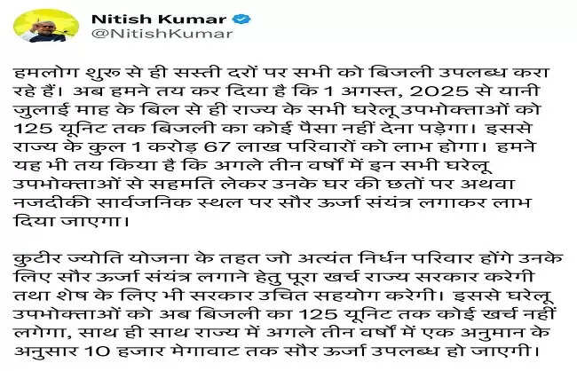पटना, 17 जुलाई । बिहार की नीतीश सरकार ने राज्य के 1 करोड़ 67 लाख बिजली उपभोक्ताओं को बड़ी सौगात दी है। राज्य सरकार ने प्रति माह 125 यूनिट बिजली मुफ्त देने की घोषणा की है। मुख्यमंत्री नीतीश कुमार ने आज सुबह एक्स पर पोस्ट कर यह घोषणा की। उन्होंने कहा, ''हमलोग शुरू से ही सस्ती दरों पर सभी को बिजली उपलब्ध करा रहे हैं। अब हमने तय कर दिया है कि 1 अगस्त, 2025 से यानी जुलाई माह के बिल से ही राज्य के सभी घरेलू उपभोक्ताओं को 125 यूनिट तक बिजली का कोई पैसा नहीं देना पड़ेगा। इससे राज्य के कुल 1 करोड़ 67 लाख परिवारों को लाभ होगा।'' मुख्यमंत्री ने कहा, ''हमने यह भी तय किया है कि अगले तीन वर्षों में इन सभी घरेलू उपभोक्ताओं से सहमति लेकर उनके घर की छतों पर अथवा नजदीकी सार्वजनिक स्थल पर सौर ऊर्जा संयंत्र लगाकर लाभ दिया जाएगा। कुटीर ज्योति योजना के तहत जो अत्यंत निर्धन परिवार होंगे उनके लिए सौर ऊर्जा संयंत्र लगाने के लिए पूरा खर्च राज्य सरकार करेगी तथा शेष के लिए भी सरकार उचित सहयोग करेगी। इससे घरेलू उपभोक्ताओं को अब बिजली का 125 यूनिट तक कोई खर्च नहीं लगेगा, साथ ही साथ राज्य में अगले तीन वर्षों में एक अनुमान के अनुसार 10 हजार मेगावाट तक सौर ऊर्जा उपलब्ध हो जाएगी।''
