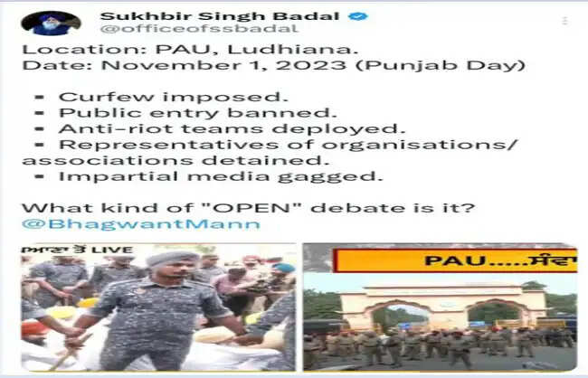 पंजाब सरकार ने बुधवार को आयोजित ‘मैं पंजाब बोलद’ बहस कार्यक्रम में अकाली दल की तरफ से सुखबीर बादल ने भाग नहीं लिया। इस बहस के लिए सुबह 10 बजे से दोपहर 12 बजे तक का समय रखा गया था। बहस का समय पूरा होने से पहले सुखबीर बादल ने सोशल मीडिया पर पोस्ट करके कहा कि लुधियाना कृषि विश्वविद्यालय के आसपास कर्फ्यू लगा हुआ है। कार्यक्रम में आम जनता की एंट्री बैन कर दी गई है। चारों तरफ एंटी-रोयट्स टीमों को तैनात किया गया है। कई संगठनों के प्रतिनिधियों को नजरबंद किया गया है। स्वतंत्र मीडिया का गला घोट दिया गया है। यह किस प्रकार की खुली बहस है।