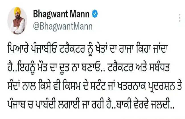 इस बीच सोमवार को पंजाब के मुख्यमंत्री भगवंत मान ने ट्वीट करके कहा कि सरकार ने ट्रैक्टर पर स्टंट करने पर पूर्ण रूप से रोक लगा दी है। भगवंत मान ने कहा कि पंजाबियों को ट्रैक्टर को खेतों का राजा कहा जाता है, इसे मौत का फरिश्ता मत बनाओ। पंजाब में ट्रैक्टर और संबंधित उपकरणों के साथ किसी भी तरह के स्टंट या खतरनाक प्रदर्शन पर प्रतिबंध लगाया जा रहा है। उन्होंने किसानों से आग्रह किया है कि किसी प्रकार का कृषि उपकरणों को स्टंट में न इस्तेमाल किया जाए। मुख्यमंत्री ने कहा कि इस संबंध में गाइडलाइन तैयार की जा रही है, जिसे जल्द ही लागू कर दिया जाएगा।